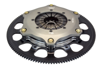 T3R-G01 race, twin disc kit offers twice the number of disc surfaces for better wear, heat capacity and long life compared to single disc kits. These kits use a proprietary Positive Lift Floater System design, which results in quiet operation with no floater rattle and no posts to wear. ACT twin disc kits undergo an exclusive four-stage, heat-treating process on all diaphragms. The ACT twin disc features the ability to adjust for disc wear and provides equal disengagement for discs. ACT's 6-pad rigid race discs are made with high quality, ceramic friction materials. The chrome-moly hub is heat-treated for strength and durability. The lightweight, rigid design allows for quicker shifts and trouble-free service. All ACT twin disc kits include a CNC-machined and dynamically balanced flywheel to ensure trouble-free installation and operation. ACT twin disc kits include a pressure plate, two discs, a floater, flywheel and alignment tool. Some kits may include a pilot bearing and release bearing.