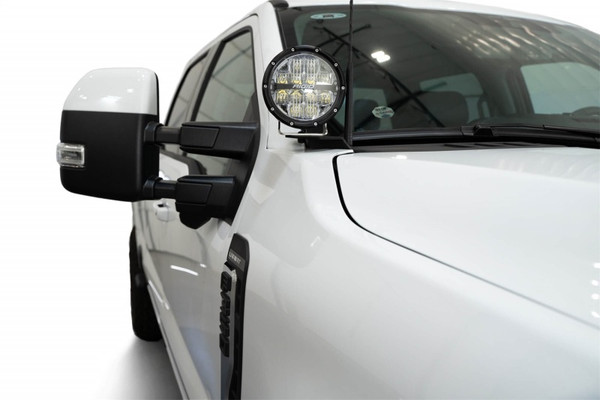 Our Ditch Light Brackets provide supplemental lighting for worksites and off-road use, accommodating lights ranging from 3 in. Rigid cube lights to Baja Designs LP6. These brackets are made from ?-inch steel with a hammer black powder coat finish for style and protection. They attach to hood hinges near the a-pillar, avoiding obstruction of the sightline, and allow for adjustable light positioning. Made in America.