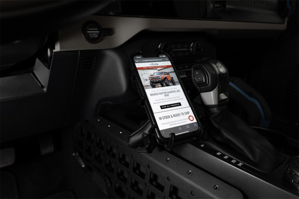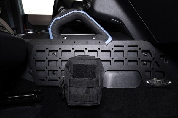 The ADD Center Console Molle Panels are constructed from 1/8th inch steel and finished in hammer black powder coat. The kit comes with driver and passenger side panels, each with a row of 8 PEM nuts along the top for easy installation of device holders. The molle design on each panel allows you to strap, bolt or clip accessories like radios, holsters, or other gear to them. The dual panel design ensures that all factory controls remain fully accessible. These panels are made in America.