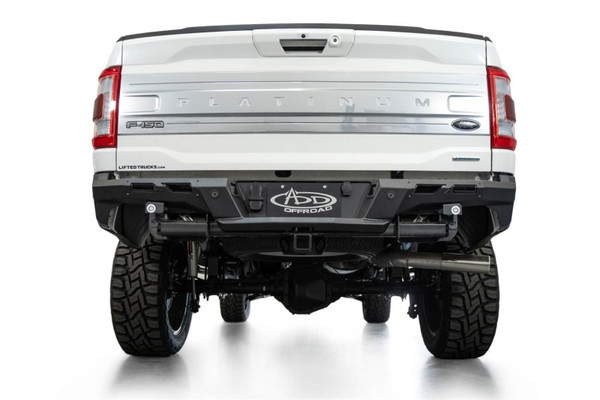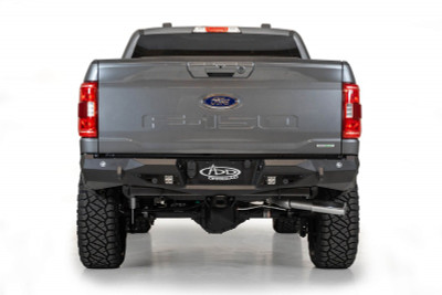 Our Rear Bumper provides a sleek design that retains all of the OEM features. The bumper features spare tire access, and it is compatible with the factory parking sensors, tow hooks, and trailer hitch & plug. Integrated into the bumper is a license plate light. It is finished in a 2-stage hammer black powder coat with satin black accent panels. The bumper is fully bolt-on and constructed from steel. Made in the USA. * Please Note: The OEM Bumper Hitch Flashing requires removal for installation.