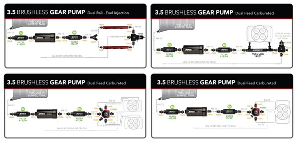 The market leader in fuel delivery systems and components, Aeromotive introduces its first brushless fuel pump series. The 3.5 Brushless Gear pump provides the Pro-Series Fuel Pump performance the world has come to trust and depend on, now available with the latest Spur-Gear pumping mechanism and brushless-motor technology. Built for up to 90 psi of sustained pressure, this new pump supports Pro-Series flow at higher pressures with minimal drop in flow. This new brushless spur-gear pump is able to move more fuel and sustain higher pressures without failure. ORB-12 inlet and ORB-10 outlet ports. For EFI applications use regulator P/N 13134 or P/N 13305. For carbureted applications use regulator P/N 13202 or P/N 13212. Capable of 90-PSI continuous operating pressure, 150 PSI peak pressure, base plus boost. Perfect for ?blow-through? carbureted engines up to 2,000 FWHP. Brushless motors employ sensors to monitor rotor angle to provide faster and more reliable phase shifting, producing more torque capacity and motor efficiency. Instead of the armature rotating, in a brushless motor the magnets rotate around the armature and the motor controller manages the phase shift to keep the motor rotating under load (load is related to pressure in a fuel pump).? With more torque per watt and a higher torque to weight ratio, brushless motors produce lower noise and deliver higher reliability. With a higher level of efficiency, down to fractions of a second in design speed control, the new Aeromotive brushless fuel pumps provide precise control of fuel pump RPM as pressure rises, better maintaining pump RPM and flow, producing a flatter flow curve.? Tight tolerances result in less current draw, less heat and extended life. Now there is the ability to upgrade to a premium brushless pump for faster, more reliable and uninterrupted fuel delivery with less power consumption and potential for wear or failure.
