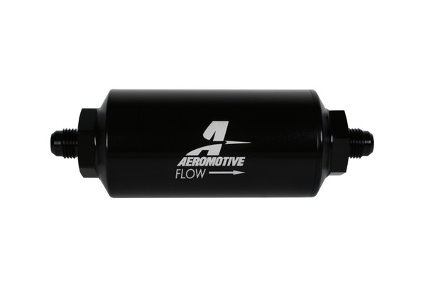 AN-06, 10 micron cellulose element, black anodize finish An inexpensive insurance policy to protect your investment, proper filtration is key to fuel system performance. Engineered filter solutions are required to achieve protection with minimum restriction. For 200 ? 3,000 plus HP applications, our filter assemblies offer unmatched flow, ease of installation and maintenance, along with the impeccable machining and finish you?ve come to expect from all Aeromotive components. High-flow, 10-micron cellulose?replaceable element. Flows 2,000 lb/hr with a pressure drop of less than 1 PSI. Male AN-06. All filter assemblies feature an O-ring for positive sealing in high pressure applications. CNC-machined from 6061-T6 aircraft aluminum. Bright dip black anodized finish for a corrosion resistant, show car quality appearance.