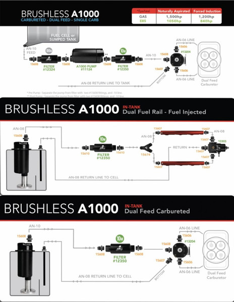 Designed as a direct drop-in replacement for the any Aeromotive Stealth Fuel Cell, including COPO, Cobra Jet or Drag Pak race cars. This configuration is also a great option when building a 10? deep custom fuel cell. The A1000 performance you expect and more. Fuel Injected Engines: up to 1300 FWHP ? naturally aspirated, up to 1000 FWHP ? forced air induction. Carbureted Engines: up to 1500 FWHP ? naturally aspirated, up to 1200 FWHP ? forced air induction. E85 Compatible, reduce max FWHP by 30%. Lighter than the traditional A1000 pump. Reduced current draw at higher, EFI pressures. Extended service life in methanol and ethanol. Integral, external brushless controller for clean installation, cooler fuel and enhanced reliability. Quieter than the traditional A1000 Stealth Pump. ORB-10 outlet port. Requires straight 12-VDC to 16-VDC power supply. Not compatible with pulse modulated systems or fuel pump speed controllers. Aeromotive?s True Variable Speed Controll er offers the advantages of built-in pump speed control via a dedicated 0-5V analog DC input signal. The Controller capitalizes on our existing brushless technology by reducing fuel flow during low engine demand and decreasing an already low current draw, therefore minimizing both motor heat the introduction of environmental via reduced fuel recycling. EFI rated flow of 700 lbs./hr. @ 45 psi, 13.5 volts. Carb rated flow of 900 lbs./hr. @ 9 psi, 13.5 volts.
