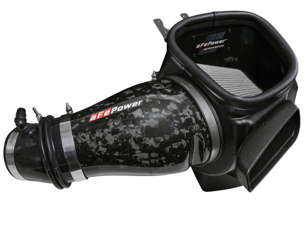 This 7†tall 360-degree radial flow air filter features a 5-1/2" by 7-1/2" flange and our oil-free Pro DRY S media with three layers of synthetic media for maximum convenience. Its progressive layering provides great filtration efficiency and dust holding capacity, while not requiring the use of oils. This media is best suited for street and light off-road use. The included massive air filter is surrounded by an open-element XLPE (cross-linked polyethylene) polymer housing that minimizes warm engine air for maximum performance. Its open design allows for easy viewing of the air filter and delivers an aggressive Air Intake sound. Multiple air inlets bring in cool air when under power without capturing any warm air surrounding the engine. The factory MUA (Multi-Air Unit Actuator) is easily transferred to the aFe POWER housing to guarantee correct crankcase flow, avoiding check engine lights and damaging factory hoses and sensors. The lightweight tube is computer-designed to achieve maximum power gains while maintaining a perfect fit. Manufactured from 100% forged carbon fiber, it features zero fiberglass and is clear-coated for the highest quality construction, inspired from the optional forged carbon fiber interior accents. This is a direct fit intake system that utilizes factory mounting points. All necessary stainless-steel clamps, silicone coupling, and hardware are included. Its revolutionary design, featuring our patent pending filter-to-housing interface, uses half the number of parts of a traditional cold air intake system.