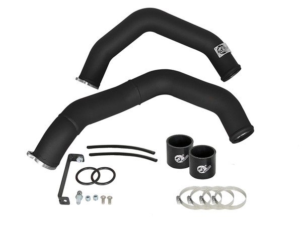 Perfect Fit: Includes stainless steel clamps for a leak-free seal and heavy-duty 5-Ply reinforced silicone coupling for strength. Mandrel-bent Tubing: Constructed of 2-1/4" mandrel-bent aluminum tubing for maximum flow then, powder-coated for a nice finish. The high-temp powder-coating also insulates the tubes from engine heat and protects the tubes from corrosion. The smooth transition bends decrease turbulence, minimize pressure loss, while increasing horsepower and torque. These tubes are also equipped with a billet aluminum factory style adapter that seals with an o-ring. One 1/8" NPT port which is provided on each tube for a sensor or water-methanol injection. aFe Badging: Unique aluminum laser-cut aFe Power logo plate is welded-on for an aggressive style.