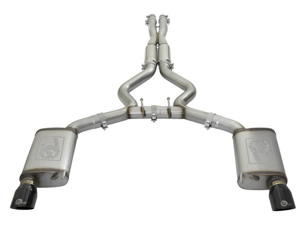aFe is proud to introduce an all new MACH Force-Xp cat-back dual exhaust system for the 2015-2017 Ford Mustang with the V6-3.7L & V8-5.0L engine. In testing, this system resulted in gains up to +12 horsepower and +10 lbs. x Ft. of torque verified by our in house dyno. (Tested on a 2015 Mustang V6-3.7L) This cat-back exhaust system utilizes full 3" tubing with 2-1/4" clamp-on reduction tubes to fit OE connections. Remove them and combine with the aFe Power Twisted Steel long tube headers and connection pipes (P/N: 48-33012-YC) for added flow and performance. This system incorporates dual, high-flow mufflers to improve performance across the power band while maintaining an aggressive sound. aFe also added an X-pipe with resonators to balance and evenly distribute exhaust pulses traveling through the exhaust system, creating more efficient flow and better performance while minimizing exhaust drone resulting in an awesome sound. To finish off the exhaust, dual 4" gloss black 304 stainless steel tips are included. This is a direct bolt-on system no modifications necessary and includes necessary hardware for a hassle-free installation. Aggressive Sound: Dual free-flowing mufflers are used to absorb high pitch tones producing a powerful sound and unleashing all available horsepower and torque. X-Pipe with Resonators Balance Tube: The equalizer balance tube evenly distributes exhaust pulses traveling through the exhaust system. This creates a more efficient flow for better performance while minimizing exhaust drone. Simple Installation: This is a direct bolt-on system which retains your factory exhaust tips and includes necessary hardware for a hassle-free in stallation. No modifications necessary. Leak-Free Seal: High quality band clamps are used for a complete 360 degree sealing surface. Dual 304 SS Tips: Finishing off this unique exhaust system are dual, aFe laser etched, 4" gloss black 304 stainless steel tips for an aggressive style.