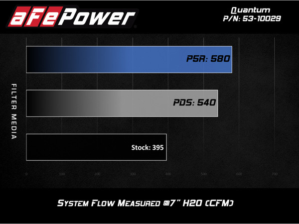 This 360-degree radial flow air filter features a 5" flange and our pre-oiled Pro 5R media with five layers of progressively finer cotton gauze media for maximum performance. It provides your engine with the largest amount of high-flowing air and delivers the highest power gains in most cases. This media is perfect for street use. Its inverted top makes for more filter surface area, resulting in longer service intervals. The filter features an injection molded base and top for lighter weight and rigidity. Its base includes a built-in 3-angle velocity stack for smooth, even airflow and captive screws to easily attach the filter to the housing. Quantum uses an integrated filter-to-housing design that attaches both components with four captive screws, making for a positive surface area seal, as well as easy installation and maintenance. Its durable sealed housing features a unique, five rib, industrial-grade look for aFe quality recognition. Quantum uses a dyno-tuned, computer designed intake tube to achieve optimum air flow and a perfect fit. Its XLPE (cross-linked polyethylene) polymer material is heat soak resistant and extremely durable. This Quantum intake system includes a flexible bellows-style coupling and a durable reinforced silicone coupling. Quantum intakes are designed with fewer parts for a quick and easy installation. This is a direct fit intake system that utilizes factory mounting points and requires no cutting or modifications. All necessary clamps, couplings, and hardware are included.