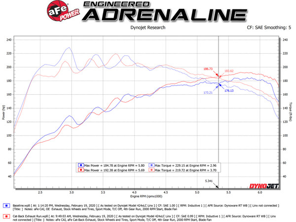 Performance Gains: This system produced gains of up to +11 HP and +10 lbs. x Ft. TQ., as measured on our in-house dyno. 3" - 2-1/2" 304 Stainless Steel Construction: This cat-back exhaust system is constructed of 3" - 2-1/2" mandrel-bent 304 stainless steel tubing for maximum strength and durability. Dual 4-1/2" Diameter Blue Flame Exhaust Tips: Finishing off this exhaust system are dual 4-1/2" diameter blue flame 304 stainless steel clamp-on exhaust tips. The tips feature a laser etched Takeda logo for a unique style. Powerful Sound: This system produces a powerful sound unleashing all available horsepower and torque. Installation: Some cutting may be required, see instruction sheet for further information. Utilizing factory style flanges and hangers this system mounts directly to factory mounting locations for a hassle-free installation. Integrated Mitered Merge Collector: A mitered merge collector is used to decrease turbulence and increase exhaust velocity resulting in increased horsepower, torque and improved throttle response. Computer-Aided Design: Utilizing state-of-the-art computer-aided design technology, this exhaust system is designed for custom, high tolerance factory fitment. MIG-Welded: 100% MIG-Welded for race-proven strength and durability. Resonator: This system features a 4" x 16" 304 stainless steel resonator to reduce drone. An optional resonator delete pipe is available (PN 49-36622). Emissions Disclaimer: This product does not require a CARB EO#. aFe POWER exhaust systems are engineered and manufactured in our Corona, California facility.