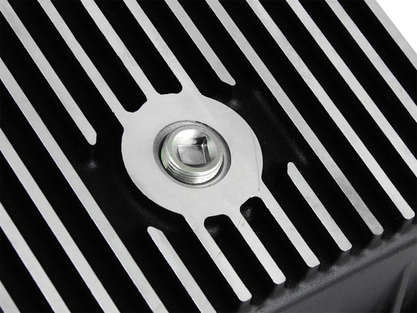 aFe Powers new deep transmission pan brings performance engineering to the protection of your trucks transmission. This transmission pan has additional capacity for 3 to 4 more quarts over stock at the factory line, a magnetic drain plug and a 1/8" NPT port for your temperature sensor. Built-in internal and external fins transfer heat from the fluid to the outside air for maximum cooling. This transmission pan is constructed out of durable die-cast A380 aluminum with reinforced ribs and a wrinkle black powder-coating for maximum strength and styling.