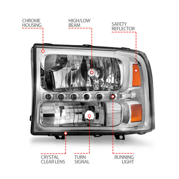 Crystal Headlight Set, Clear Lens, Chrome Housing, Pair, w/1 pc. LED, Not For Use w/Sealed Beam Headlights, . Guaranteed To Improve Your Vehicles Appearance. Rigorously Tested For Fit And Function. Simple Plug And Play. No Modifications Required. Easy Installation Using Common Hand Tools. Uses Stock Mounting Locations And Hardware. D.O.T. Compliant To S.A.E. Standards. Sold As A Pair. Does Not Fit F-250 Light Duty Or Sealed Beam Models.