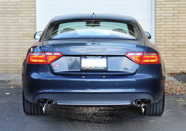 S5 4.2L Touring Edition Exhaust System The more civilized member of the family is the S5 4.2L Touring Edition Exhaust. In addition to the central muffler from the Track Edition Exhaust, our Touring Edition system features an x-pipe for enhanced exhaust scavenging and also features AWE 180 Technology®. For S5 owners looking to fine tune the sound even more, we offer our Resonated Downpipes. Our Resonated Downpipes feature resonators larger than the stock units, along with larger diameter tubing in order to produce a mellow sound volume. Tips AWE's Touring Edition comes with 90mm (3.5 inch) slash-cut tips, available in standard chrome silver or our noted diamond black finishes. The tips sport engraved AWE logos and are double walled to ensure a mirror polish, even under hard usage. Each tip is individually adjustable, so stagger and depth into bumper can be set according to personal taste.