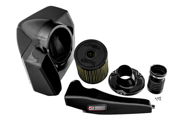 Break the mold with AirGate™. The AirGate™ Carbon Intake allows options for those seeking more volume from their intake when under boost. Want to hear more turbo inductions sounds from within the cabin? Go lidless. Prefer to keep it a bit more stealthy? Simply bolt the AirGate™ lid in place with a few turns of two easily accessible hex screws. Constructed of genuine 2x2 carbon fiber with a UV-stabilized resin and clear coat, the AirGate™ Carbon Intake mounts securely to the stock location and integrates with the factory ducting perfectly via the AirGate’s floating airbox inlet. The S-FLO Filter: The included AWE S-FLO Filter is designed specifically for this airbox to be easily serviceable and to maximize airflow. This increase in airflow unlocked maximum gains of 17 hp and 13 lb-ft of torque at the wheels for the 3.0T, and 16 hp and 3f t-lbs of torque at the wheels for the 2.9TT when paired with a piggyback tuner. The combination of carbon fiber airbox and included S-FLO Filter makes for a more aggressive intake note, with an intoxicating turbo spool sound.