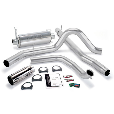 Amplify your truck's performance at the friendliest price around! Gain up to +50 hp/+88 lb-ft 8 Percent more towing MPG Black tipPickup: Amplify your truck's performance at the friendliest price around! Banks Git-Kit produces rear-wheel gains up to +50 hp, +88 lb-ft torque and saves you an average of 8 percent in fuel when you're toting something heavy behind you. Maintains safe EGTs to preserve engine durability. Fitment Notes: Important - Some vehicle configurations require an extension kit for proper fit. 1999 Power Stroke variations: Ford trucks for model year 1999 fall into three categories: 1999, early 1999.5, late 1999.5. It is important to know the specific model. Check the build date on the tag inside the driver's door, then match: 1999 model year (built prior to 1/99 with catalytic converter), Early 1999.5 model year (built prior to 1/99, no catalytic converter, intake manifold has 2 inch-diameter inlets), Late 1999.5 model year (built on or after 1/99, no catalytic converter, intake manifold has 3 inch-diameter inlets). 1999-2003 F-350 cab-and-chassis (no bed) trucks: If fuel tank is behind rear axle of the vehicle, use systems for F-450/550 trucks. 1999-2003 pickups other than standard-cab long-bed or extended-cab short-bed require Exhaust Extension Kit. Git-Kit not available for 2001-2003 (275 hp) pickups.Git-Kit Bundle, Power System with Single Exit Exhaust, Chrome or Cerakote Black Tip for use with 1999 Ford 7.3L F250/F350, with Catalytic Converter