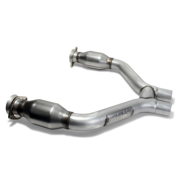 BBK Performance short mid H pipes with catalytic converters are specifically designed to be used with BBK full Length exhaust headers to complete the exhaust installation to your cars cat back exhaust system. This BBK mid pipe is designed and built with 2-3/4 in. CNC mandrel bent tubing for maximum exhaust flow and high flow catalytic converters. All BBK mid pipes feature ball and socket style connectors for simple installation and adjustment for good ground clearance. The BBK merged H center section crossover is designed to maximize the exhaust flow potential of your Mustangs high performance engine to get the maximum horsepower and torque available to the ground. Every BBK mid X pipe offers performance, quality and value that guarantees years of top performance for your Mustang.