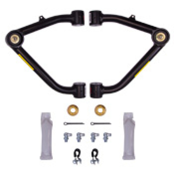 B8 Control Arms are a direct fit upgrade for factory upper control arms on trucks and SUVs. The kit contains a pair of control arms which correct the caster alignment for better straight line stability with lifted suspensions, and the improved pivot angles increase wheel travel and reduce stress on the joints. These strong black powder-coated 4130 chromoly steel arms are a tubular design which allows for more spring and shock clearance and feature greasable polyurethane bushings and heavy duty ball joints for the ideal combination of ride quality and durability with minimal maintenance needed. They come with detailed instructions and all necessary hardware for easy installation and are compatible with all Bilstein shocks and coilover kits. All components are replaceable.