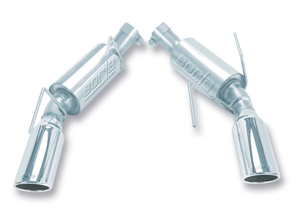 For over 4 decades, Borla Exhaust has been the choice of Mustang experts, from the Cobra-R SVT Mustang to the Ford GT. Major players in the racing industry and leading tuners from Roush, Steeda, Saleen and Ford Racing to the Shelby 427 Cobra have relied on Borla. This awesome Axle-Back system bolts on, is lighter than the factory system, includes our famous S-Type mufflers with outstanding flow numbers that generate great power enhancements, and features bright chrome on T-304 stainless steel tips. These attributes, coupled with an aggressive sound of power and awesome big tip, proclaim this Stang is all business. Airflow management and exhaust engineering is a science with which Borla has more experience than anyone in the exhaust aftermarket. The performance matches the famous Borla systems of the past but with a unique muffler and exhaust configuration canceling additional high frequency sound waves. Delivering a significant increase in CFM from the factory system which, as most engine builders will confirm, accounts for the dramatic power improvements. Perhaps more importantly, this added flow maximizes performance for other aftermarket enhancements installed on the Mustang because all Borla exhaust products are tuned for maximum output from any aftermarket performance upgrade. Two Axle-Back options are also available: an aggressive S-Type (PN 11750) and a more mellow Touring (PN 11752) both replace only the over-the-axle pipes, mufflers and tips. Borla, the original pioneers of high-quality, T-304 austenitic stainless steel (superior to 409 or aluminized steel) free-flow exhaust utilizes patented award and race winning technology to deliver quality, sound, performance gains and enhanced fuel economy all with an easy bolt-on installation. Unsurpassed written Million-Mile Warranty.