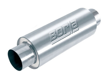 High quality austenitic stainless steel. Patented, race-winning XR-1 Raceline technology. 3 options: Offset - Made with the same patented, flow through design as the XR-1 Sportsman oval. The inlet/outlet are offset to the same side of the muffler, to accommodate transmission and frame rail interference on some applications Oval -- BORLAs #1 selling racing muffler. Satisfies the needs of most racing applications because it is the lightest, most compact, and highest flowing racing muffler in its class and at a competitive price. Record-holder Hurley Blakeney has run BORLAs on his AA/AT Ford T-Bird because he loves the quieter driver compartment without giving up any power.Round - Made with the same patented, flow through design as the XR-1 Sportsman Oval. This Muffler is 5 inches in diameter and 15 inches long. Designed for door car/ roadster applications that require a compact round muffler.