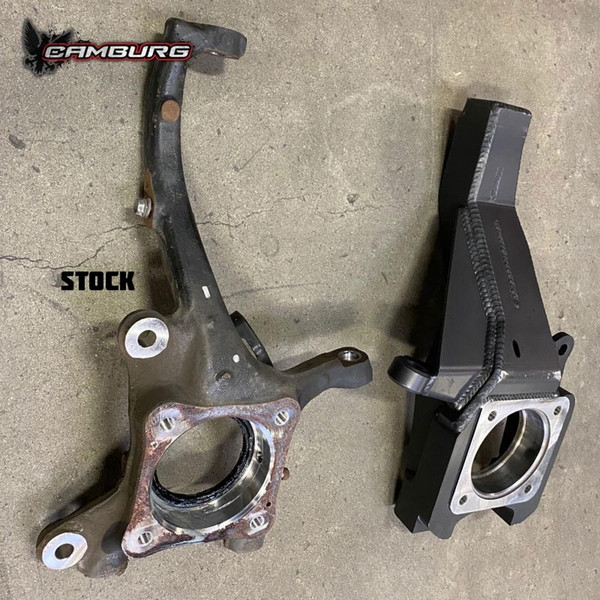 Introducing our Camburg performance spindles, the strongest stock replacement spindles/knuckles on the market. Designed to work with our long-travel kit and stock length lower arms, these spindles offer enhanced strength and craftsmanship. We have leveraged our 13+ years of experience with the stock design and custom versions for the military to create a superior product. Our spindles feature improved geometry and increased durability, along with a relocated ABS speed sensor for off-road protection. Compatible with both 4WD and RWD models, these spindles require no modifications and maintain the factory specifications in terms of lift and width. Using advanced Faro scanning technology and SolidWorks CAD/CAM modeling, we manufacture these spindles in-house for precise control. Starting with steel billets, we heavily CNC machine them for weight reduction and precision, followed by MIG welding of laser-cut plates. The spindles are then sandblasted and powder coated textured black for a durable finish. They come ready to install with all necessary hardware, including stronger stainless braided Kevlar reinforced front brake lines. For 2016+ models, drilling out the brake caliper bolt holes to 9/16" is required due to larger metric bolts. We recommend replacing the inner hub seal on older or higher mileage 4WD vehicles. Please note that these spindles are designed as OEM replacements and are not compatible with drop-down bracket lift kits.