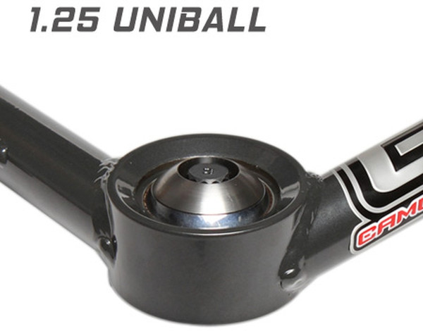 Our 1.25" uniball upper arms for '10-14 Ford Raptors offer technical improvements while keeping costs down. They use polyurethane bushings instead of heims, allowing for less maintenance. The smaller uniball allows for the use of factory offset wheels and tires. By replacing the stock ball-joint with a larger 1.25" uni-ball bearing, we increase wheel travel and durability under extreme conditions. Our arms also improve alignment, driving characteristics, and handling. Manufactured in-house, they are made from 4130 chromoly and feature laser-cut and CNC-bent tubes, MIG welding, and a steel gray powder-coating. Polyurethane frame pivot bushings with grease-able zerk fittings and FK 1.25" PTFE-lined uniballs are included. All necessary hardware is provided, and the arms are designed for 1-3" of lift. When using the factory OEM 17" wheel, a 1/4" wheel spacer may be needed for larger tires. Made in the USA.