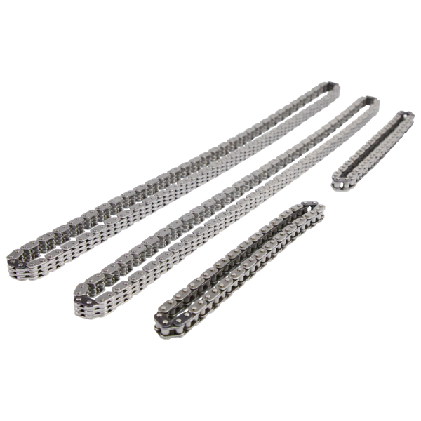 The COMP Cams Hi-Tech Timing Chain Sets for Ford Coyote engines are designed to withstand the stresses of upgraded, modified applications and are the perfect choice when replacing fatigued, worn out factory chains. Any time the cams are being upgraded in a Ford Coyote engine, or it is being built for high RPM racing use, replacing the tired, stock timing chains is a must. The new COMP Cams Hi-Tech Ford Coyote Timing Chain Sets feature heavy-duty secondary chains with 15% thicker plates than the factory chains, which helps to prevent common secondary chain failure. These kits also include premium quality primary chains that are ideal for any high performance or racing application. Whether simply upgrading camshafts or doing a full race engine build, these timing chain sets provide the durability needed in aggressive racing environments. Sets include two primary and two secondary chains.