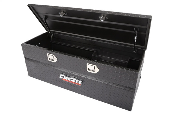 Dee Zee Tool Box - Red Label Chest. Constructed of heavy duty Brite-Tread aluminum. Black-Tread powder coat, provides a gloss black finish while it protects and prevents oxidation. Crown style lid...