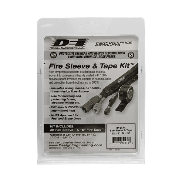 Fire Sleeve solves the problem of heat and abrasions damaging fuel, transmission and brake lines and is a fireproof solution. Constructed from a high temperature resistant braided glass material, woven into a sleeve and heavily coated with 100% iron oxide silicone rubber, Fire Sleeve thermal insulator sleeve provides the ultimate in heat insulation and protection from direct heat up to 500°F. Includes a 16-inch length of black Fire Tape, an adhesive-free, self-adhering tape, to finish off ends of Fire Sleeve or when joining two Fire Sleeves together while presenting a clean and professional look. Insulates wiring, hoses, oil / brakes / transmission lines & more Use for bundling & protecting hoses, electrical wiring, etc. Withstands 2000°F of intermittent heat Includes 16 inches of black Fire Tape Size: 1 inch x 36 inches Fitment Chart AN Conversion Chart AN Size Metal Tube O.D. Thread Size 2 1/8 in. 5/16 24 SAE 3 3/16 in. 3/8 24 SAE 4 1/4 in. 7/16 20 SAE 5 5/16 in. 3/8 18 SAE 6 3/8 in. 9/16 18 SAE 8 1/2 in. 3/4 16 SAE 10 5/8 in. 7/8 14 SAE 12 3/4 in. 1-1/16 12 SAE 16 1 in. 1-5/16 12 SAE 20 1-1/4 in. 1-5/8 12 SAE 24 1-1/2 in. 1-7/8 12 SAE 28 1-3/4 in. 2-1/4 12 SAE 32 2 in. 2-1/2 12 SAE Fire Sleeve Application Chart Part# Name Line Size* 10470 3/8 in. Fire Sleeve 3AN4AN6AN** 10472 5/8 in. Fire Sleeve 6AN8AN 10474 1 in. Fire Sleeve 10AN12AN16AN**5/8 in. Heater Hose3/4 in. Heater Hose *Braided Kevlar line was used in testing. You may notice a slight difference in size if you have Braided Stainless Steel lines. **Tight fit: If you have fittings on your line, you may need to order one size up. You can achieve between 1/16 in. and 1/8 in. stretch out of our material. This may help on installs with fittings already on the lines.
