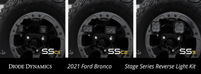 FeaturesDirect fitment compatible with Ford Bronco 2021-2023.Allows you to mount SSC1 SSC2 or SS3 LED pods to the spare tire.Custom-designed harness for simple wiring with OEM connectors and aux switch override.Provides high-power reverse light and red accent light.Bolts on to spare tire carrier using included 60mm or 90mm extension lugs.Designed and assembled in USA. Overview. There's plenty of ways to add light behind your vehicle but the new Stage Series Reverse Light Kit stands out with innovations in both function and ease of use. This kit includes an integrated red running light and plug-and-play wiring harness for trouble-free installation! Thanks to Stage Series TIR optic technology this kit provides a huge amount of extra reverse light. The included switch allows you to toggle it on any time or activate automatically with your reverse lights for a truly integrated solution.Plug and Play. Thanks to custom-molded OEM connectors this kit is completely plug-and-play. The included adapter harness plugs right into your factory tail lights for easy installation and operation. No cutting drilling or additional wiring needed! The kit operates as an additional red accent light with your tail lights and then automatically switches to a high-power backup light when your vehicle is in reverse. The included toggle switch allows you to override the vehicle signals and turn on the main beam anytime.Backlight Functionality. The Stage Series LED pods included with this kit feature a distinctive backlight in a vibrant red color which functions as an additional accent light while driving! The backlight fully illuminates the TIR optic providing a more unique and modern look than the small indicator LEDs found in other products.