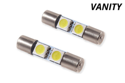 Features Direct replacement for factory 28mm festoon bulb Adds more modern LED appearance Plug and play simple installation Overview Design. The 28mm SMF1 LED bulb is a direct replacement for any 28mm-size bulb commonly found in vanity mirror lights in many vehicles. Populated with one 5050-size SMD the SMF1 upgrades the factory yellowish incandescent bulb to a more modern LED appearance. The SMF1 was designed with an embedded load resistor and implanted diode for superior reliability. With its durable metal terminals it will fit snugly in the socket and its light weight means it won't vibrate loose over time. Reliability. Unlike other bulbs on the market this bulb is built with constant-current circuitry along with transient suppression. That means this bulb will last for years not months with no flickering or failure. And like every Diode Dynamics product it's backed by an industry-leading three-year replacement warranty. Brightness. With 16 lumens of true measured output the SMF1 LED will provide similar light output to your original 28mm-sized bulb. If you are looking to increase output we'd recommend checking out our SMF2 option! All Diode Dynamics LED lighting is rated with accurate measured lumen figures not calculations or guesses. We test the true output in-house and provide you the real numbers to compare. Colors. In addition to vibrant colors of blue red amber and green the SMF1 is available in a cool white 6000K and warm white 3000K option as well. Whether you want a modern cool white appearance or a traditional warm white color we have the color to fit your need!