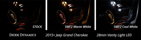 Features Direct replacement for factory 28mm festoon bulb Adds more modern LED appearance Plug and play simple installation Overview Design. The 28mm SMF2 LED bulb is a direct replacement for any 28mm-size bulb commonly found in vanity mirror lights in many vehicles. Populated with two 5050-size SMDs the SMF2 upgrades the factory yellowish incandescent bulb to a more modern LED appearance while adding far more total light output than the factory bulb. The SMF2 was designed with an embedded load resistor and implanted diode for superior reliability. With its durable metal terminals it will fit snugly in the socket and its light weight means it won't vibrate loose over time. Reliability. Unlike other bulbs on the market this bulb is built with constant-current circuitry along with transient suppression. That means this bulb will last for years not months with no flickering or failure. And like every Diode Dynamics product it's backed by an industry-leading three-year replacement warranty. Brightness. With 24 lumens of true measured output the SMF2 LED will provide about double the total light compared to your original 28mm-sized bulb. All Diode Dynamics LED lighting is rated with accurate measured lumen figures not calculations or guesses. We test the true output in-house and provide you the real numbers to compare. Colors. In addition to vibrant colors of blue red amber and green the SMF2 is available in a cool white 6000K and warm white 3000K option as well. Whether you want a modern cool white appearance or a traditional warm white color we have the color to fit your need!
