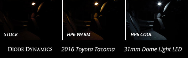 Features Direct replacement for factory 31mm festoon bulb Adds more modern LED appearance Plug and play simple installation Overview Design. The 31mm SMF2 LED bulb is a direct replacement for any 31mm-size bulb commonly found in vanity mirror lights in many vehicles. Populated with two 5050-size SMDs the SMF2 upgrades the factory yellowish incandescent bulb to a more modern LED appearance while adding far more total light output than the factory bulb. The SMF2 was designed with an embedded load resistor and implanted diode for superior reliability. With its durable metal terminals it will fit snugly in the socket and its light weight means it won't vibrate loose over time. Reliability. Unlike other bulbs on the market this bulb is built with constant-current circuitry along with transient suppression. That means this bulb will last for years not months with no flickering or failure. And like every Diode Dynamics product it's backed by an industry-leading three-year replacement warranty. Brightness. With 24 lumens of true measured output the SMF2 LED will provide about double the total light compared to your original 31mm-sized bulb. All Diode Dynamics LED lighting is rated with accurate measured lumen figures not calculations or guesses. We test the true output in-house and provide you the real numbers to compare. Colors. In addition to vibrant colors of blue red amber and green the SMF2 is available in a cool white 6000K and warm white 3000K option as well. Whether you want a modern cool white appearance or a traditional warm white color we have the color to fit your need!