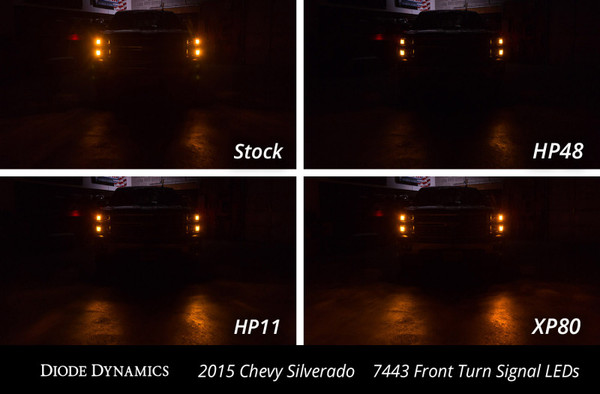 Features Direct replacement for factory incandescent 7440/7443-size turn signal bulb. Sixteen high-power 5W LEDs arranged in all directions. Metal heatsink to maintain high output. Inductive constant-current drive circuit. Increased output with LED appearance. Plug and play simple installation. 510 lumens per bulb. Overview Upgrade. Add more light output and a modern appearance to your vehicle with the 7440/7443 XP80 turn signal bulb. Populated with twelve side-firing 5W-rated LED chips and four forward-facing 5W-rated LED chips this is the brightest self-contained automotive LED bulb on the market. Housed in an aluminum casing with a textured finish for maximum heatsinking properties the XP80 will last for years to come. Best of all installation only takes minutes - simply take out your factory bulb and the XP80 will fit snugly in the socket. Brightness. At 510 lumens the XP80 will provide about double the total light output compared to your factory bulb. All Diode Dynamics LED lighting is rated with accurate measured lumen figures not calculations or guesses. We test the true output in-house and provide you the real numbers to compare. Reliability. Unlike other bulbs on the market this bulb is built with constant-current circuitry along with transient suppression. That means this bulb will last for years not months with no flickering or failure. And like every Diode Dynamics product it's backed by an industry-leading three-year replacement warranty.