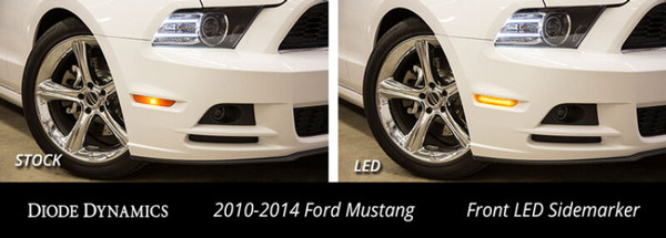 FeaturesModern LED replacements compatible with Ford Mustang 2010-2014 factory sidemarkersIncreased output with LED stylingPlug-and-play installation no modification neededIncludes four sidemarkers to replace both front and rearOEM-grade retroreflector opticsEngineered and assembled in USAOverviewUpgraded Styling. If you're looking to give your vehicle an upgrade in styling and appearance this is the perfect way to do it! These replacement units are loaded with hundreds of LEDs for a modern and unique appearance. With the full LED array they illuminate brighter than factory as well! Choose from three lens color options to match your vehicle or preference.OEM Grade. Unlike others on the market the Diode Dynamics LED sidemarkers use OEM-grade retroreflector optics which provide required the reflective safety and a clean premium appearance when off. Compare this to diffuser" or plain flat lenses without any reflective features. The units themselves are designed directly from OEM CAD data for a perfect fit and the connector plugs right into the factory socket.Reliability. Like most Diode Dynamics products these Sidemarker LEDs compatible with Ford Mustang are designed with newer constant-current circuitry and transient voltage protection. These features found in factory-installed lighting components protect the circuit over time ensuring years of flicker-free performance."