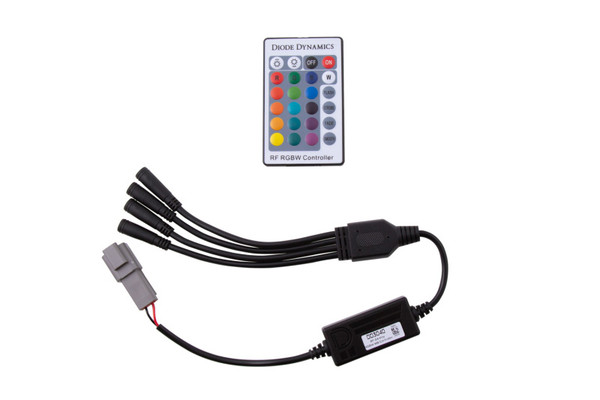 FeaturesControl RGBW products with radio-frequency remote control.16 static color options including True White.Four preset color-changing modes.Four M8-style outputs with JST adapters included.Output up to 8 amps (2A per connection).Fully waterproof and shockproof.OverviewFull RGBW. If you are looking for a reliable low-cost RGBW controller look no further! Unlike other RGB controllers that produce a mixed white color this controller is full RGBW with 16 static color options and an independent White channel. This controller also allows you to adjust the brightness of your LEDs and features four preset color-changing modes. After you have fun with colors just select True White for a crisp clean white output for everyday use.Easy Connection. With plug-and-play input and output connectors simply plug into any standard 12V signal - we recommend parking lights or direct battery. Then connect the outputs directly to your Diode Dynamics multicolor products with no cutting crimping or splicing This controller features a fully waterproof compact enclosure along with M8 output connectors for secure connections.Experience. After over a decade in business Diode Dynamics is one of the most trusted names in automotive LED lighting. We directly assemble and engineer an increasing number of products in the United States allowing for higher quality and performance with the newest and brightest LED technology. No matter what you're driving we pride ourselves in offering only the best possible LED solutions.What(TM) s IncludedOne (1) RGBW 24-Key ControllerOne (1) RGBW 24-Key RemoteOne (1) CR 2025 3V BatteryFour (4) JST-to-M8 Adapter WiresOne (1) Deutsch DT Pigtail