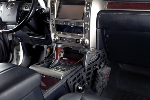 Our Molle Panels & Digital Device Bridge for the GX 460 provides efficient ways to keep your everyday items and handheld devices close and accessible. The driver & passenger side panels provide an excellent way to mount molle pouches, small tools, a holster, pocket light, and many other molle accessories. The bridge fits along the control panel, and does not interfere with any of your controls or cupholders. It?s fitted with PEM nuts (M5 x 0.8) which are compatible with RAM diamond base digital device mounts, as well as other common brands. This bridge can mount your smartphone, GPS, tablet, radio, or other handheld devices in an easily accessible location. If you choose not to use the bridge, it can be easily removed while keeping the side molle panels in place.