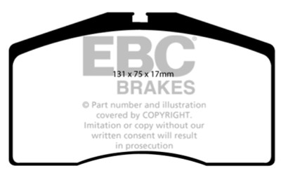 RP-X(TM) Racing Front Brake Pads by EBC(R). EBC Racings RP-X compound is an ultra-high performance track and race pad designed for performance vehicles driven hard on track and for dedicated race cars. RP-X has a very stable friction coefficient of 0.55 mu up to and beyond 850 C, making it an excellent performer for even the most demanding vehicle applications.