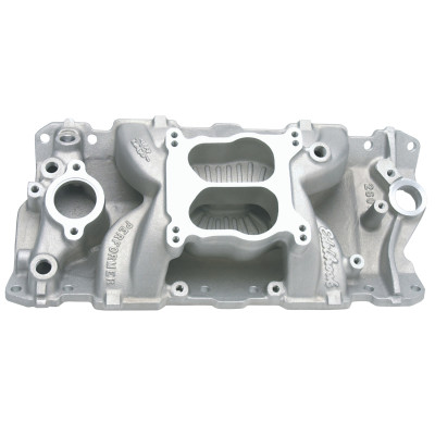 Edelbrock part #7530 RPM Air-Gap AMC intake manifold is designed for 1967-69 290-390 c.i.d. V8 applications. This RPM Air-Gap intake manifold incorporate the same race-winning technology as our Victor Series competition intakes. The air-gap design features an open air space that separates the runners from the hot engine oil for a cooler, denser charge and more power. Includes standard oil fill and PCV provisions as well as early air conditioning support bracket accessory bosses. For square-bore carbs. No provision for exhaust-heated chokes. No exhaust crossover.