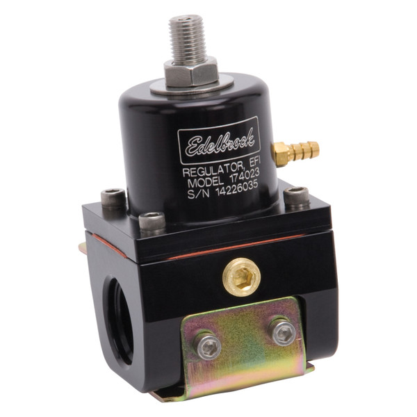Edelbrock fuel pressure regulators #174023 are machined from aircraft quality aluminum for those who demand the best. These EFI fuel pressure regulators have an internal diaphragm made of fluorosilicone to ensure high temperature protection resulting in an extended life. They are compatible with all grades of gasoline, ethanol, methanol and E85 fuels. These regulators will hold fuel system pressure for at least 20 minutes after pump shutdown. Mounting bracket and hardware are included. Each regulator features a vacuum/boost compensating port for a supercharger, turbo or intake manifold vacuum connection.