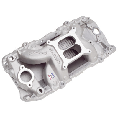 Edelbrock part #75621 RPM Air-Gap 2-R intake manifold is designed for street 396-502 c.i.d. Chevrolet V8's with high-performance rectangular-port heads. The open air space separates the runners from the hot engine oil, and as a result, the air/fuel mixture stays cooler for a denser charge and more power. This intake manifold is a dual-plane, high-rise design with a 180 degree firing order to produce incredible top-end horsepower while retaining good throttle response. The larger plenum and runners match the free-flowing exhaust, high-lift cams and other modifications of a high output engine. They are intended for high-performance's street or competition engines that run up to 6500 rpm. Includes rear water outlets, two distributor clamp locations and nitrous bosses. Accepts all late model alternator and A/C brackets for the street. For square-bore carbs only. No provision for exhaust heated chokes and no exhaust crossover. This manifold offers a polished finish for a brilliant shine and classic look.