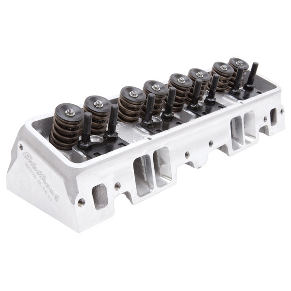 The Edelbrock part #77599 Small Block Chevy Victor Jr. 215cc cylinder head is an affordable version that will still allow for maximum power when used in competition and ultra high-performance's street applications. This cylinder head has the potential of 530-580 hp out-of-the-box, for a cost effective, race-winning set-up. These cylinder head features angled spark plug holes and accept standard 23deg valvetrain hardware. The 77599 cylinder head has a 64cc combustion chamber and come with springs for mechanical roller camshafts. The 64cc chambers yield about 12.5:1 compression with a 12cc domed piston in a 350 V8.