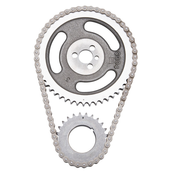 Edelbrock part #7809 Performer-Link timing chain is for use with Edelbrock or stock cams. They have a solid-bushing chain for a true bearing surface that rolls with the sprockets, eliminating chain stretch. Cam sprockets are made from 35,000 psi tensile strength cast iron. Crank sprockets are made from billet SAE-1144 steel and induction heat treated. Four Performer-Link sets are stock replacement parts and 50-state legal (see listings in bold type). All other sets have three keyway setting points to ensure accurate timing selection for early or late-model vehicles. Performer-Link timing sets are not for use above 6500 rpm- ? Performer roller chain sets are engineered to operate up to 6500 rpm.- ? Never hammer directly on chain or sprockets. You can crack the hardened links and pins and cause early failures. - ? Use a sleeve for installations that require hammering, a brass drift punch may be used if you carefully alternate blows on either side of the sprocket to avoid cocking. - ? Never stretch the chain with a screwdriver. - ? Check for clearance between the timing chain and block and between the chain and front cover before reassembly. - ? Be sure that both cam and crank sprockets are exactly in line with each other. Misalignment can cause chain to break