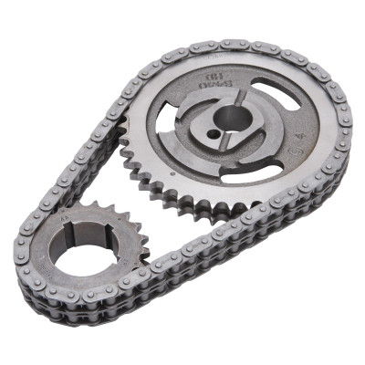 Edelbrock part #7830 Performer-Link timing chain #7830 is for use with Edelbrock or stock cams. They have a solid-bushing chain for a true bearing surface that rolls with the sprockets, eliminating chain stretch. Cam sprockets are made from 35,000 psi tensile strength cast iron. Crank sprockets are made from billet SAE-1144 steel and induction heat treated. Four Performer-Link sets are stock replacement parts and 50-state legal (see listings in bold type). All other sets have three keyway setting points to ensure accurate timing selection for early or late-model vehicles. Performer-Link timing sets are not for use above 6500 rpm- ? Performer roller chain sets are engineered to operate up to 6500 rpm.- ? Never hammer directly on chain or sprockets. You can crack the hardened links and pins and cause early failures. - ? Use a sleeve for installations that require hammering, a brass drift punch may be used if you carefully alternate blows on either side of the sprocket to avoid cocking. - ? Never stretch the chain with a screwdriver. - ? Check for clearance between the timing chain and block and between the chain and front cover before reassembly. - ? Be sure that both cam and crank sprockets are exactly in line with each other. Misalignment can cause chain to break