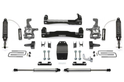 Fabtech's new 4'' F150 system utilizes their proven heavy duty construction and design features found in our 6'' systems but with less lift and at a much lower price. This 4'' Systems allows use of 35'' tall tires and features high arched lower control arm crossmembers constructed of 1/4 thick steel for maximum strength. The Fabtech ductile iron steering knuckles retain the stock track width keeping the tires under the fender for a clean appearance. Rear lift is accomplished with a block and u bolt configuration. The Performance System features Dirt Logic Stainless Steel 2.5 Coilover front shocks and Dirt Logic Stainless Steel 2.25 rear shocks for aggressive offroad capabilities with a smooth highway ride.