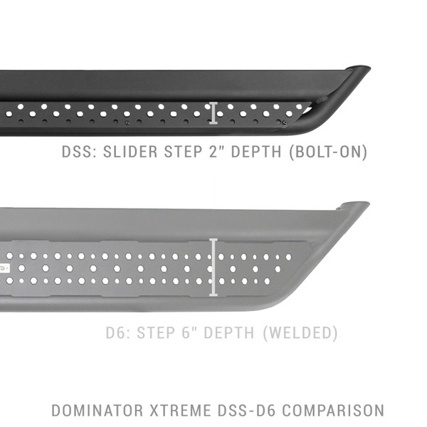 The Go Rhino Dominator DSS Slider-Step features a cab length body mount slider design on the bottom surface and a flat, punched steel step plate for a safe, no-slip grip. A two bar design with outer rub rail gives it both a unique, aggressive appearance and increased protection for your vehicle’s body panels from trail obstacles and road debris. The steel step plate is removable for a minimal, off-road look or paintable for customization. Installation is easy and the utilization of the OEM step mount locations means no drilling or cutting required. Hardware and brackets are included. The DSS Side Steps come with a Limited Lifetime warranty on materials and construction and a 5 year warranty on the Textured Black Finish.
