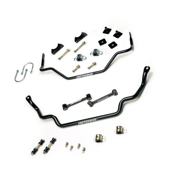 Hotchkis Sport Suspension 22114 1964 ? - 1966 Mustang Sway Bar Set from Hotchkis Sport Suspension. Improve the handling performance and traction of your 1964 ? - 1966 Ford Mustang Coupe Fastback or Convertible with the Hotchkis Sport Suspension Sway Bar Set. This autocross and track event ready Sway Bar package features a Lightweight 32mm (1.25?) 4130 Tubular Steel Front Sway Bar and a Lightweight 22mm (0.875?) DOM Tubular Steel 3-Way Adjustable Rear Sway Bar that allows roll stiffness tuning for improved handling balance and traction. Handling and traction are dramatically improved while the adjustable design allows for tunability for specific car set ups. This Direct Bolt-On Installation kit comes with Premium Mounting Hardware Including: Steel U-Bolts Laser Cut Axle Mounts & Frame Rail Mounts Polyurethane Bushings and Grade 8 Bolts TIG Welded Steel Dogbone End Links with Polyurethane Bushings and Durable Gloss Black Powder Coat Finish. Hotchkis Adjustable Sport Sway Bars are one of the fastest easiest and most dramatic modifications you can make to the first generation Mustang virtually eliminating body roll dramatically improving steering response and control. With the 3-position adjustable rear sway bar the driver can tailor the balance and handling characteristics to match their driving needs. Developed as part of a balanced system Hotchkis Sport Sway Bars give the Mustang balanced handling especially when combined with Hotchkis Rear Sport Leaf Springs Front Sport Coil Springs and 1.5 SPS Shocks. Polyurethane bushings and heavy duty bushing brackets are also included along with Zerk fittings for easy lubrication. Made in the USA bolt a pair on today and feel the difference.