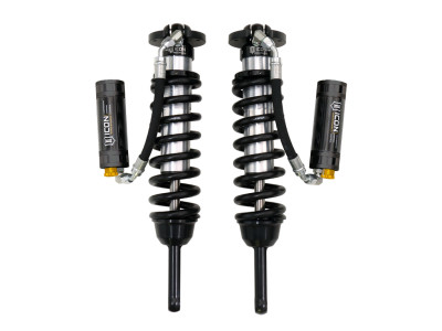 ICON Vehicle Dynamics V.S. 2.5 Series remote reservoir front coilover shocks are an incredible upgrade for the front end of the 2005-2023 Toyota Tacoma. These adjustable coilovers allow up to 0-3.5†of lift height adjustability on 2005-2015 models or 0-2.75†of lift height adjustability on 2016-2023 models, allowing the use of larger, more aggressive wheel and tire combinations. ICON’s Vehicle-specific shock length and valving along with the larger 2.5†shock body and increased piston area over stock components yield the maximum travel possible along with superior ride quality and suspension performance both on- and off-road. Remote reservoirs greatly increase shock oil volume and heat dissipation surface area to resist overheating and cavitation under hard use, which can lead to damper fade. When paired with ICON 2.0 or 2.5 Aluminum Series rear shock absorbers vehicle control will be balanced front to rear, resulting in the best overall driving experience for your Toyota Tacoma.