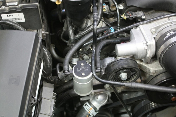 During the process of venting crankcase pressure back through your intake track, large amounts of oil, in the form of vapors can gather/accumulate in your intake tube, intake manifold runners and even dilute your gas, lowering its octane level. This happens on all engines and is even worse with forced inducted vehicles (supercharged and turbocharged) as crankcase pressures are increased. To combat this, we have developed an oil separator of our own design. Milled from solid billet aluminum this is a rock-solid piece. It has a knurled tank base for easy removal to drain the spent oil and an O-ring seal to prevent any leaks. Filtering consists of a fine mesh stainless steel screen that traps fine oil vapors and releases them once heavy enough to fall. They then pass through a 1/2" thick 1/16th" aluminum honeycomb filter where they grow every larger and then fall into the bottom. By the time the oil gets through the filter it's too heavy to be passed on into the intake. The tank holds 3 oz of fluid, while that may not sound like a lot, you shouldn’t see that much oil in your PCV system. Drain it every 2000-3000 miles and you will never come close to filling it.