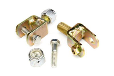 Convert the weak stem type shock mounts on your Jeep Wrangler TJ, LJ or JK to accept standard EB1 eyelet-style shock absorbers with JKS conversion brackets. Massive 7/8 in. mounting studs provide ultimate strength and security. Lowers the upper shock mount 1.10 in. for easy bolt access and additional droop. Conversion accepts popular extreme-travel aftermarket shock absorbers. Zinc plated for corrosion resistance.