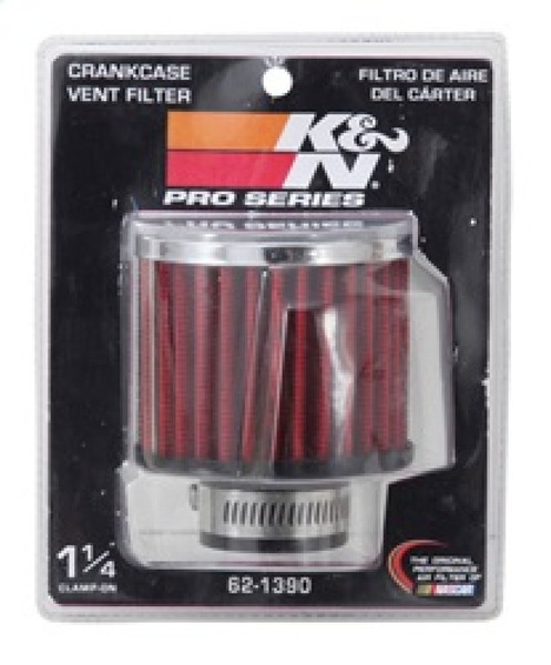 K&N crankcase vent filters are perfect for racing applications, vintage cars or individuals who want to add some aesthetics to their classic carbureted engine. The 62-1390 crankcase vent filter has a K&N embossed chrome-plated steel top with a black rubber base. The filter is 2-1/2 inches tall, 3 inches in outside diameter with a 1-1/4 inch flange which is designed to push on to the existing rubber breather grommets. This air filter is constructed with non-woven synthetic filter media so it can be cleaned and reused repeatedly. Note: Legal in California only for racing vehicles which may never be used, registered, or licensed for use upon a highway. See knfilters.com for CARB status on each part for a specific vehicle.