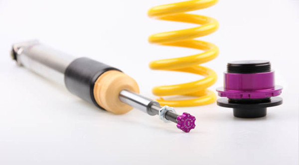 Cutting-edge motorsports technology for more performance on the road. Like every suspension product developed by KW automotive, the suspension manufacturer, and manufactured in Germany, the KW V3 Coilover suspension kit also provides a significant plus in safety reserves in road traffic. Thanks to the chassis with its high-quality dampers, springs, and elastomer spring elements, pitching and rolling movements during load changes such as evasive maneuvers, cornering, acceleration, and braking are significantly reduced. The braking distances are also shortened. Thanks to improved support and feedback, drivers not only feel safer but driving in everyday life becomes even safer. With compression and rebound stage damping, that can be set separately and independently of each other, the damper setup can be customized to your personal driving preferences or vehicle changes such as weight, tire characteristics, or altered vehicle rigidity. True performance optimization is only possible with this unique, patented system. For example, this allows the compression damping force to be increased and get more grip from the tires, to improve cornering behavior and reduce squat without simultaneously altering the rebound stage damping which is optimally matched to the spring rate, a scenario which results in reduced grip and the associated loss of performance. The KW V3 coilover kit is the ideal tool for performance-oriented drivers and experienced tuning enthusiasts who place a strong emphasis on the overall performance of their suspension. The Variant 3 features patented TVR-A and TVC-A technology that provides separately adjustable rebound and compression damping. The extensive adjustment range of the independently configurable rebound and compression make it easy to directly influence the steering behavior, directional stability, grip and handling characteristics for confident and repeatable results at the limit of driving dynamics.