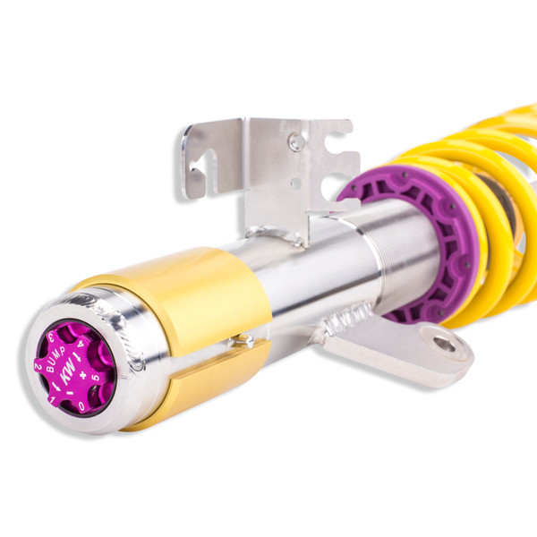 Cutting-edge motorsports technology for more performance on the road. Like every suspension product developed by KW automotive, the suspension manufacturer, and manufactured in Germany, the KW V3 Coilover suspension kit also provides a significant plus in safety reserves in road traffic. Thanks to the chassis with its high-quality dampers, springs, and elastomer spring elements, pitching and rolling movements during load changes such as evasive maneuvers, cornering, acceleration, and braking are significantly reduced. The braking distances are also shortened. Thanks to improved support and feedback, drivers not only feel safer but driving in everyday life becomes even safer. With compression and rebound stage damping, that can be set separately and independently of each other, the damper setup can be customized to your personal driving preferences or vehicle changes such as weight, tire characteristics, or altered vehicle rigidity. True performance optimization is only possible with this unique, patented system. For example, this allows the compression damping force to be increased and get more grip from the tires, to improve cornering behavior and reduce squat without simultaneously altering the rebound stage damping which is optimally matched to the spring rate, a scenario which results in reduced grip and the associated loss of performance. The KW V3 coilover kit is the ideal tool for performance-oriented drivers and experienced tuning enthusiasts who place a strong emphasis on the overall performance of their suspension. The Variant 3 features patented TVR-A and TVC-A technology that provides separately adjustable rebound and compression damping. The extensive adjustment range of the independently configurable rebound and compression make it easy to directly influence the steering behavior, directional stability, grip and handling characteristics for confident and repeatable results at the limit of driving dynamics.